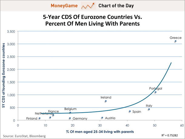The chart below depicts the correlation between 5-year CDS (a form of insurance to protect against a credit event) of eurozone countries and the percentage of men ages of 25 to 34 still living at home with their mom and dad.