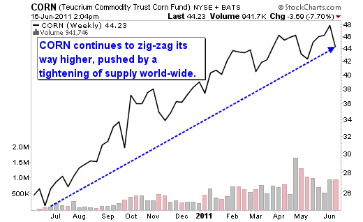 The CORN fund is already in the Crisis Profit Hunter portfolio, and subscribers should have nice open gains. Other ways to play higher corn prices include Archer Daniels Midland (ADM) and Corn Products International (CPO).