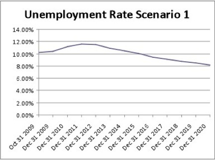 And just to demonstrate that I am not being too pessimistic, you can go to a study the Bureau of Labor Statistics put out yesterday. They estimate that the economy will create 15.3 million more jobs in the next ten years, which is an average of about 1.5 million a year, or 125,000 a month. That is not a robust number, and suggests that the continued high unemployment projected in the graph above may not be far off target, as the employment assumptions are not that dissimilar. If you have no social life, you can read it yourself at http://www.bls.gov/news.release/ecopro.nr0.htm.