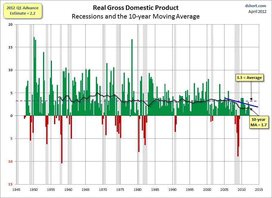 Despite unprecedented monetary inflation, stimulus and bailouts, the economy has barely recovered. The chart below (from Doug Short) displays post-war real gdp growth. The black line shows the 10-year average which has been in a steep decline since 2006. At the time, the Bush II recovery was the weakest on record. It has been surpassed by a pathetically weak recovery (statistically) under Obama. The growth rate in each of the past seven quarters has been below the the 10-year moving average.