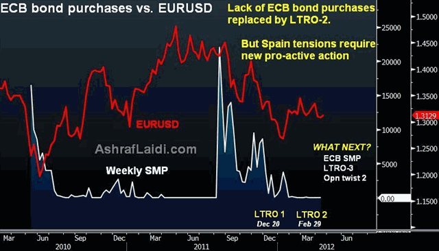 The chart below shows how zero purchases from the ECBs Securities Market Programme (SMP) was replaced by the LTRO-1/2 program and Greek Private Sector Initiative deal (PSI), all of which were effective in shorting up risk appetite and the euro at the expense of sovereign yields. Unless the ECB acts with the next dosage of stimulus (LTRO, SMP or swap operations with the Fed, EURUSD is most likely to finally break the $1.2950 floor.