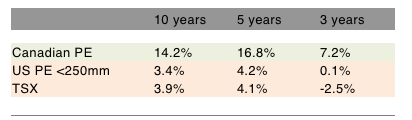 Private Equity (“PE”): Canada has some of the best PE returns globally (particularly smaller transactions):