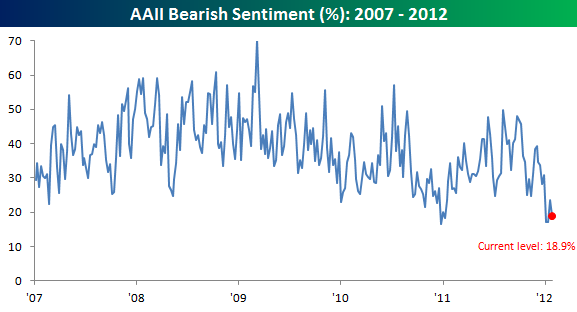 The weekly sentiment survey from the American Association of Individual Investors (AAII) showed that bullish sentiment rose to 48.4% from 47.2%. On the other end of the spectrum, bearish sentiment dropped to 18.9% from 23.6%. While this week’s drop in bearish sentiment looks like a large shift, we would note that it doesn’t even erase the 6.4 percentage point rise we saw in the prior week. That being said, there have only been four other weeks since the start of 2006 where bearish sentiment was lower than it is now. Two of them were this January 2012, and the other two were in December 2010 and January 2011…..