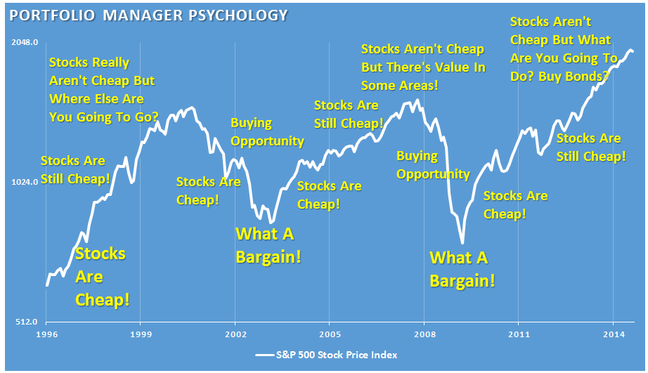 As I have written previously, Wall Street money managers are a highly conflicted lot. They are incented, because of the extraction of fees, to keep you always invested in the financial markets. The chart below shows the “excuse/rationalization” of portfolio managers over time.