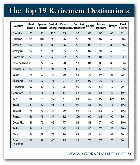 And we asked: What is the Internet like? Do you need a car? Can you catch a movie in English? Are the people friendly? Does it rain? In effect, we asked all the questions you should ask when you’re considering a retirement overseas. This year’s Top 19 foreign locations are listed below: