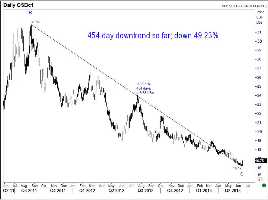 Sugar weekly chart for additional perspective: If this pattern analysis is correct, we are close to a bottom in sugar. If so, the next long-term leg up could be a huge.