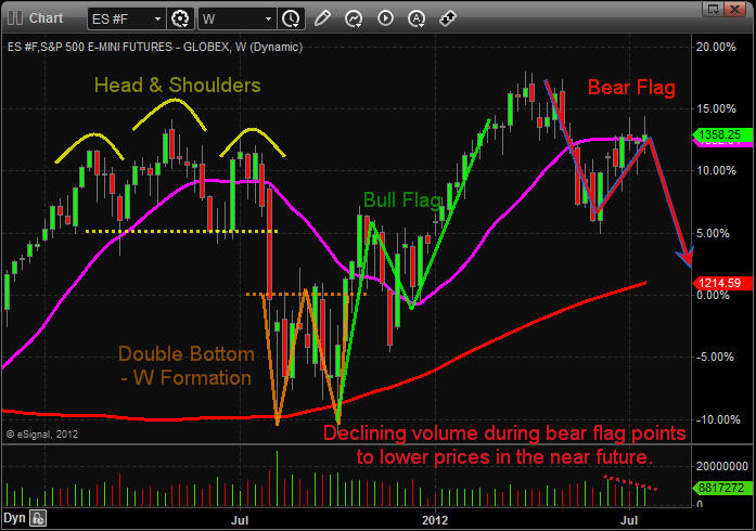 Technically, we’re currently seeing a number of bearish indicators setting up in the S&P and other markets. First, on the weekly chart of the S&P 500 Futures we can see what appears to be a bear flag formation developing. Note the recent rise in price since the beginning of June on decreasing volume.