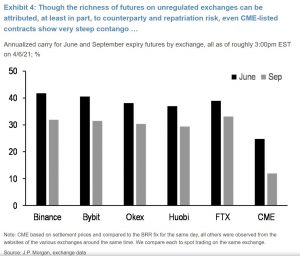 Anyway, this is clearly starting to get the attention of some on Wall Street. It was a topic of conversation I heard about last week and then on Friday JPMorgan’s rate derivatives strategist Josh Younger put out a report on the steepness of the Bitcoin futures curve. He calculated that as of last week the June CME contract was offering a 25% annualized yield relative to spot.