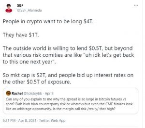 But again, how many institutions with any scale are touching these exchanges? The yields are there, but execution risks abound. In a tweet last week, the CEO of FTX Sam Bankman-Fried (a recent Odd Lots guest) explained the situation like this: