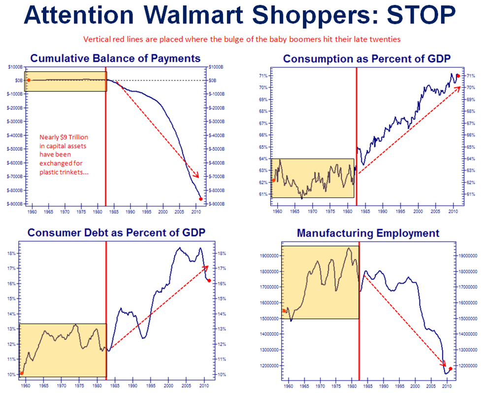 Click Chart for Larger Version: While it is difficult to properly attribute blame for the collapse of the US economy, which commenced in the early 1980s, on either the Fed’s policy of easy money starting with Alan Greenspan (and terminating with today’s statement by Goldman that merely a suggestion of “not easing” may be equivalent to “tightening” – a symptom of a terminal junkie), or the resultant self-indulgent lifestyle of the maturing baby boomers, one thing is certain: the paradigm downturn of the United States began in the early 1980s.