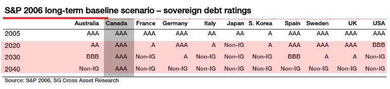 According to research by SocGen, by 2040 Canada will be the only G7 country with investment grade sovereign debt. By as early as 2030 the US, France, Italy and Japan will all lose investment grade status. To put this into perspective this means that in less than 2 decades the debt of countries currently representing approximately 50% of global GDP will be ineligible for investment by the smallest municipal pension fund.