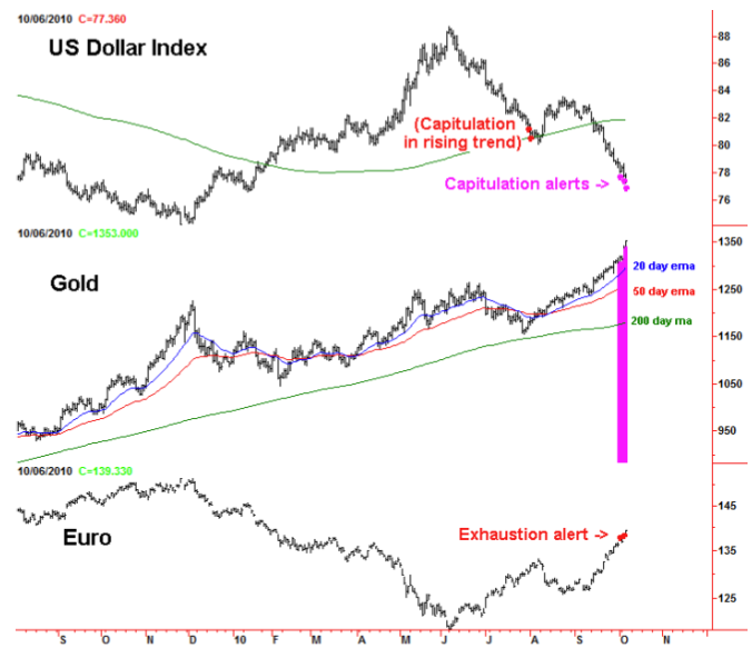 Both Friday and Tuesday generated downside Capitulation Alerts in the US Dollar Index and upside Exhaustion Alerts in the Euro. In the eleven instances (dating back to 1975) where gold was trending higher, above a rising 200-day moving average, and the US Dollar Index generated a downside Capitulation Alert the bullion made an interim top shortly thereafter.