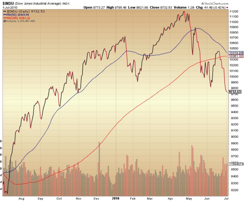 This week most observers believed we would see equity window dressing for 2nd quarter end. By that I mean that we should have seen a stock market rally. But as you know by now equity markets in the U.S. (and I might add around the world) have broken down. Luminaries such as Richard Russell believe we are now beginning a dark journey to much lower equity levels. 9800 on the Dow Industrials and 4400 on the Transports was crucial. Yesterday those market unraveled lower.