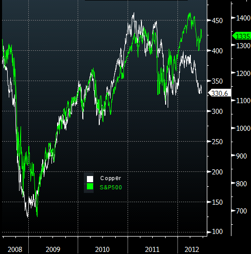 The dislocation between US equities and Brent crude (chart below and discussed there) is by no means unique. A very similar picture is developing between S&P500 and copper. And as with oil, one can blame it on supply fundamentals, but the reality has more to do with a sharp deterioration in global demand as world economies slow.