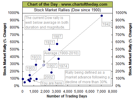 The Dow made another post-financial crisis rally high Thursday. To provide some further perspective to the current Dow rally and in response to several requests, all major market rallies of the last 111 years are plotted on today’s chart. Each dot represents a major stock market rally as measured by the Dow with the majority of rallies referred to by a label which states the year in which the rally began. The difference between today’s chart and last week’s chart is that for last week’s chart a rally was defined as an advance that followed a 15% correction (i.e. a major correction). For today’s chart, however, a rally is being defined as an advance that follows a 30% decline (i.e. a major bear market). As today’s chart illustrates, the Dow has begun a major rally 13 times over the past 111 years which equates to an average of one rally every 8.5 years. It is also interesting to note that the duration and magnitude of each rally correlated fairly well with the linear regression line (gray upward sloping line). As it stands right now, the current Dow rally that began in March 2009 (blue dot labeled you are here) would be classified as well below average in both duration and magnitude.