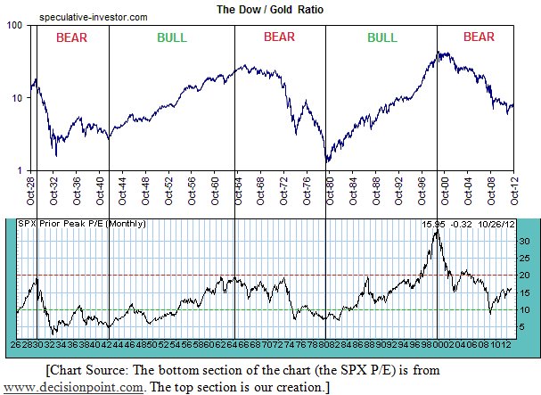 We are revisiting this topic today because our October 1st commentary omitted an important indicator of a gold top. It’s an indicator we’ve included in many TSI commentaries over the past 10 years that for some unknown reason escaped our most recent discussion of what to look for when trying to determine if gold’s bull market is nearing its end. We are referring to the relationship between gold and the U.S. stock market. The relationship is illustrated below and can be expressed as follows: Secular trends in the Dow Industrials Index relative to gold go hand-in-hand with secular trends in stock market valuation (represented on the following chart by the S&P 500’s price-to-peak-earnings ratio, also known as the Hussman P/E). Due to this relationship, gold probably won’t be close to a major peak relative to the Dow until after the SPX’s Hussman P/E makes a prolonged move to single digits. To put it more succinctly, near a major gold top the U.S. stock market will be very under-valued.