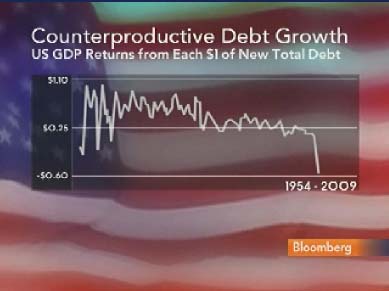 Marc Faber discusses America’s unsustainable debt load in this interview with Margaret Brennan on Bloomberg TV. An amusing observation: the GDP growth from each $1 of new total debt has dropped from $0.25 to -$0.60. Also some much deserved Bernanke and Krugman bashing. Why it is so difficult to realize that the only way out of the crisis is to cut corporate and sovereign debt, we don’t understand. Ah yes, because for that to happen, equity values across virtually all of the US economy would be wiped out… And that would destroy the myth that there is any real equity value in America.