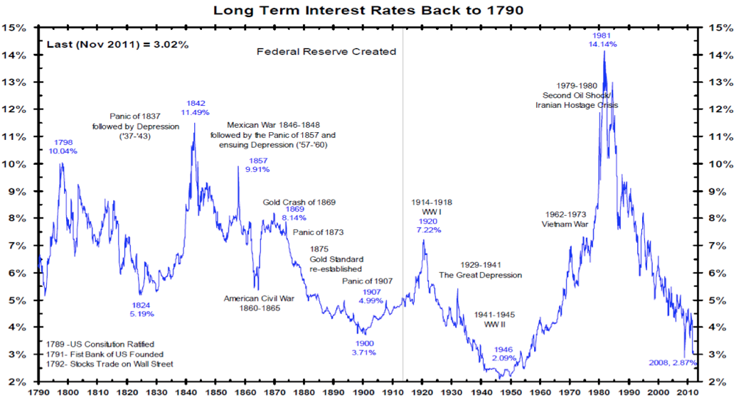 This chart since 1790 ties in nicely with discussion of the generational cycles in interest rates and underlines just how insanely low rates are today. Best advice to those still in debt: don’t use current rates to borrow more–use them to become debt free. History assures us that this-low-rate-time too shall pass. I personally look forward to the next phase where Central Banks are taken out of the driver’s seat, budgets are balanced, and markets are left to freely find fair value again. It is not a question of if–centuries of history tells us this will happen. The question is just how much mess and pain must intervene before they do.