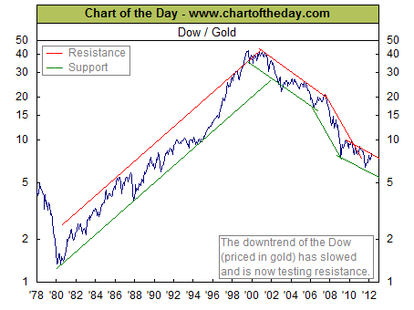 For some perspective on the long-term performance of the stock market, today’s chart presents the Dow priced in another global currency — gold (i.e. the Dow / gold ratio). For example, it currently takes less than a mere eight ounces of gold to ‘buy the Dow’ which is considerably less than the 44.8 ounces it took back in 1999. Priced in gold, the Dow has been in a massive 12-year bear market. Recently, the downtrend of the Dow (priced in gold) has slowed to its slowest pace since peaking at the end of the previous century. In fact, the Dow (priced in gold) is now testing resistance of its reduced downtrend channel thanks in part to a significant correction in gold itself.