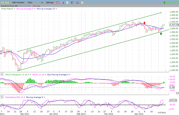 After last week’s SPX performance it’s possible that the market correction is over. The cycle low which was ideally due for next week may have come in about a week early, and could have been responsible for the spike down to 1359 and the subsequent rally. This would mean that the 1357 low of 4/10 has held and that the SPX could see higher prices before it is challenged again.