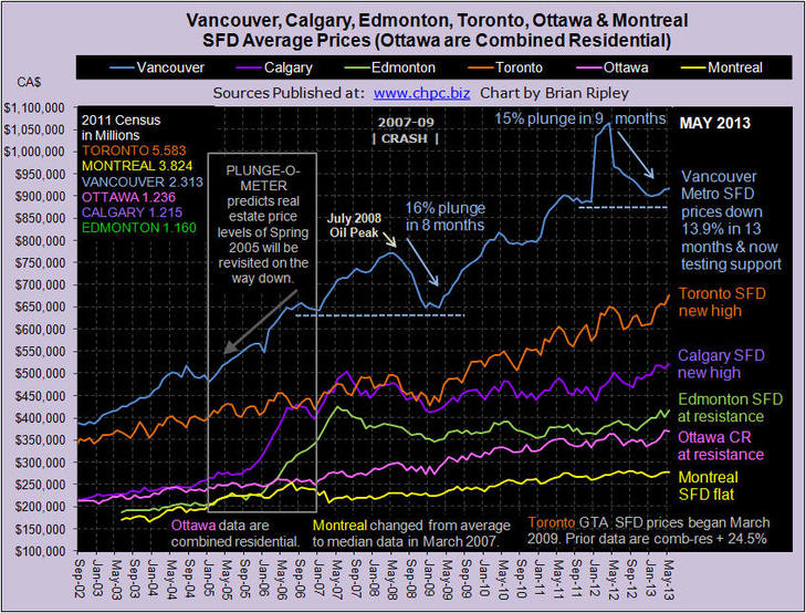 VANCOUVER average single family detached prices in May 2013 ticked up 0.4% M/M but remain 13.9% ($147,600) below their peak set last April 2012 (Vancouver Chart). On an annual basis, Vancouver is on a choppy sea of red (Scorecard) with combined residential prices down 4.3% Y/Y and detached housing taking most of the hit. Average strata units, for the commoners, continue to trade at 2007 prices but up in the penthouses it’s zenga zenga and who knows, maybe bunga bunga as a $25,000,000 condo sale get’s printed up in all the media as the biggest Canadian MLS condo sale on record, eg: CBC