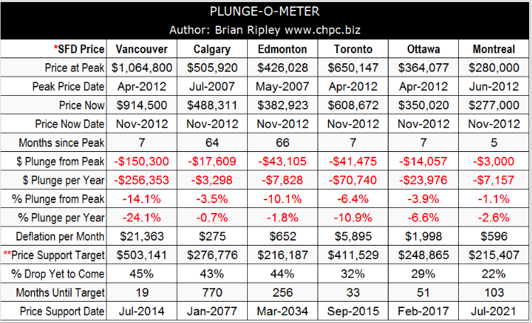 Vancouver average single family detached prices in November 2012 dropped again for a seven month plunge of 14.1% and a loss of $150,300 which is greater by 22% than the 2007-09 crash amount and the current plunge is an 85% retracement of the $177,329 gain since the beginning of the year (Vancouver Chart). At the “low end” strata prices slipped again and townhouses are 13.5% below their July 2011 peak and condos are down 9.9% below their April 2011 peak (Scorecard). Vancouver strata units are trading at 3Q & 4Q 2007 price levels and the Plunge-O-Meter predicts 2005 price levels will be seen again.