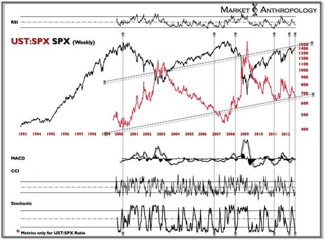 As the market sets sail into what historically has been the most treacherous month of the year (September) – a number of my analog and comparative charts continue to flash warning signals as they extend themselves up to resistance (UST:SPX ratio), into historical extremes (Apple) and into possible momentum downturns (2007/2012 SPX Analog). (Ed Note: The UST:SPX ratio is the 10 Yr US T-Note Price / S&P 500 Large Cap Index)
