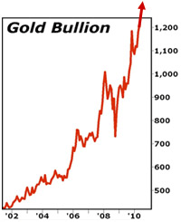 Larry: For gold it is a very different strategy. Gold is going up right now despite a rising dollar. It will go up even more when the sovereign debt crisis hits the dollar, and the dollar starts plunging like the euro is. I expect it to hit $1,300, then $1,500 and then ultimately to at least $2,300 an ounce.
