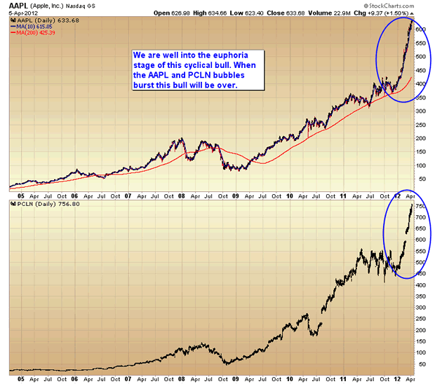 Two stocks, AAPL and PCLN, have been the leaders of this bull market. Both have entered the euphoric “bubble” stage. When the Apple and Priceline parabolas break it will almost certainly signal the end of this bull market.