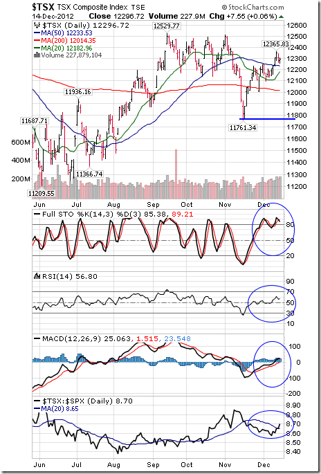 Historically, the strongest three week period for North American equity markets is from December 15th to January 7th. According to Thackray’s 2012 Investor’s Guide, average gain during the period since 1950 was 2.0%. The gain by the NASDAQ Composite Index was better. Average gain per period since 1971 was 3.0%. As the book says, “Santa arrives early and leaves late”. One of the reasons for the Santa Claus rally is the end of tax loss selling pressures (particularly in the gold equity sector this year). Other reasons include upbeat reports released by the investment community predicting encouraging prospects for the next year, lower than average institutional volume and a buoyant mood by individual investors during the Christmas holiday period. This year, the first step toward resolution of the Fiscal Cliff provides an extra “kicker”.