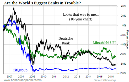 This chart isn’t hard to figure out. It simply compares the largest, most systematically important banks in the world: Mitsubishi UFJ (MTU), Deutsche Bank (DB), and Citigroup (C). Their share prices are down 66%, 80%, and 90% over the past 10 years.