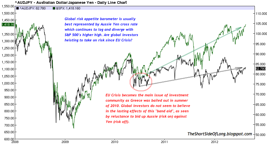 - Global risk appetite is usually best represented by the Aussie Yen exchange rate cross. Australian central bank is seen as a super hawkish inflation fighter during economic upturns, while capital naturally finds its way into Japanese Yen during downturns as a safe haven – a perfect risk on / risk off barometer. Aussie Yen cross continues to send a warning signal for other risk assets