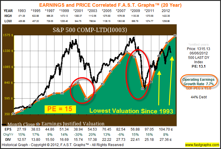 In an attempt to clarify my point, I presented the following F.A.S.T. Graphs™ (actually one very close to this one, but with slightly different dates) in my most recent article illustrating that the S&P 500 is modestly undervalued at this time. The orange line on the graph represents a P/E ratio of 15 applied to an earnings growth rate (slope of the line) of 7.7% since the beginning of calendar year 1993. All of the data is historically actual, with the exception of an estimate for 2012 earnings currently at $104.70 per share.