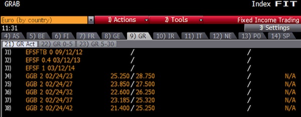 The “new” debt is already trading in the market, even though it has not actually been issued. (Don’t bother traders with messy details, just do the deal.) This page from Bloomberg is just too delicious not to print, sent to me courtesy of Dan Greenhaus of BTIG. It shows the new Greek bonds trading at over a 71-79% discount, depending on the length of maturity. Note this is AFTER the 53% haircut already imposed. That reads to me like the market value of original Greek debt is now between 12 and 14% of the original face value. Didn’t I write in this letter early last year that Greek debt would ultimately get a 90% haircut? Let me suggest to my critics that what was pessimistic back then may prove to have been optimistic at the end of the day.