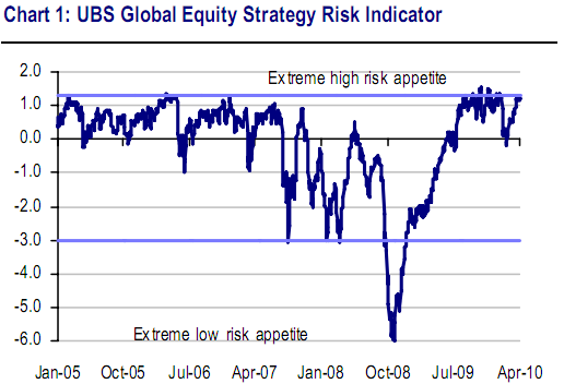 UBS called the bottom of the recent downturn to the exact day on February 9th (see here). They’ve been bullish since then, but are now warning of extreme risks in the market. According to their Risk Appetite Indicator, risks are surging as the market advances and investors turn increasingly complacent:
