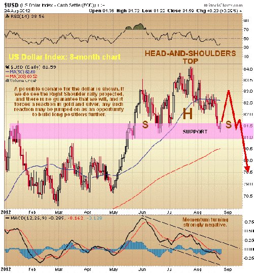 ‘…so a likely scenario here is that we see a rebound short-term which takes the index back up towards the left shoulder high in the 83 area, and such a rebound would of course be the occasion for a reaction back in gold and silver, which should be jumped on as an opportunity to build positions further ahead of the major breakout. Here we should note that the dollar looks very weak so it might not make it as high as 83 before it turns tail and breaks down.’
