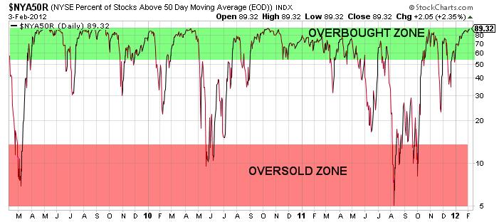 The chart above clearly illustrates that as of Friday’s closing bell (02/03) over 89% of stocks were trading above their 50 period moving averages. Consequently that reading is one of the highest levels that we have seen in the past 3 years. In addition, over 73% of stocks that trade on the NYSE are currently priced above their longer-term 200 period moving averages. Another extremely overbought signal.