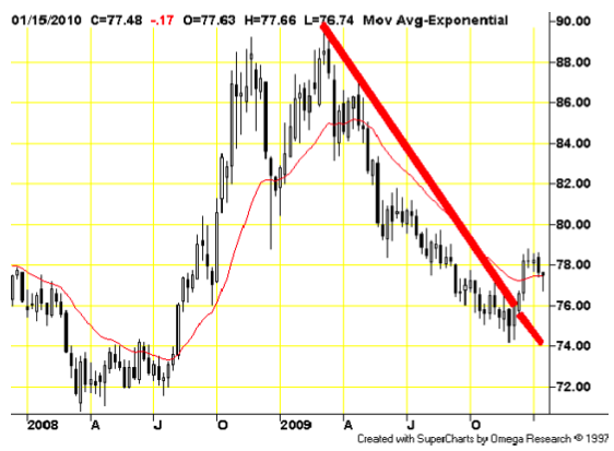 Also… I want to talk about something that I wrote yesterday regarding why the euro was seeing a slide down the slippery slope… I said it was the “German Investor Confidence falling again… but the more I thought about it, and then a reader asked me about it, I knew that the Massachusetts election was playing with fire in the currency markets too… The currency traders were looking the possibility of a Republican victory, which would not be a good thing for the health care bill, and therefore the dollar wouldn’t have to worry about an additional $1.5 Trillion in deficit spending if the health care failed…