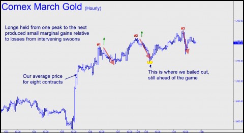 How does that advice relate to the chart above?  To begin with, when we advised buying eight gold contracts in two places below current levels, we “knew” exactly how much we stood to make on the trade because our proprietary technical indicators said a 1771.50 target would be reached come hell or high water. We took partial profits when the futures rose as anticipated, but we reluctantly kissed the last piece of our position goodbye when it tripped a stop-loss during a particularly vicious after-hours swoon. Although our confidence in the 1771.50 target had verged on certitude – still verges on certitude — we were not about to let ego and greed supersede the boring math of sound risk management. And that is why we exited the last 25% of our long position when the futures did their fake kamikaze dive.  Now, although it could prove difficult to climb back aboard (as we intend to do), the hard work and diligence that may be required is preferable to seeing our profits gyrate wildly from day to day, and possibly evaporating entirely if price action turns even more rabid.